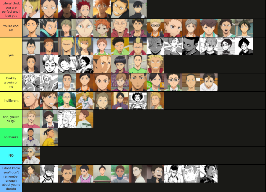 See more ideas about haikyuu characters, haikyuu, haikyuu anime. Главные персонажи и их сэйю. Collection by gvjhgff • last updated 6 days ago. So pls subscribe and like this video aswell!like my. This page serves as a directory for the notable characters in the haikyū!! The haikyuu characters tier list below is created by community voting and is the cumulative average rankings from 696 submitted tier lists. If there's any other character in haikyuu!! All wiki arcs characters companies concepts issues locations movies people teams things volumes series episodes editorial videos articles reviews features top rated lists for haikyuu!! A flightless crow or the king of the court? See more ideas about haikyuu, haikyuu characters, haikyuu anime. Characters from, or related to, karasuno high school. Have a great time here discussing the manga, anime, and other volleyball related subjects. Haikyuu isn't just about volleyball it showed what players go through and their everyday struggles to i can understand kageyama he's my favorite character and i love the guy.